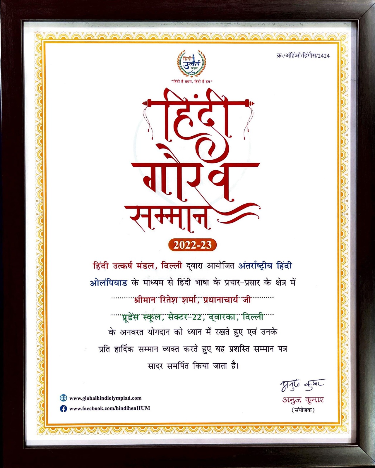 Mr. Ritesh Sharma, Principal of Prudence School, Sector-22, Dwarka, Delhi, is bestowed with a commendation certificate