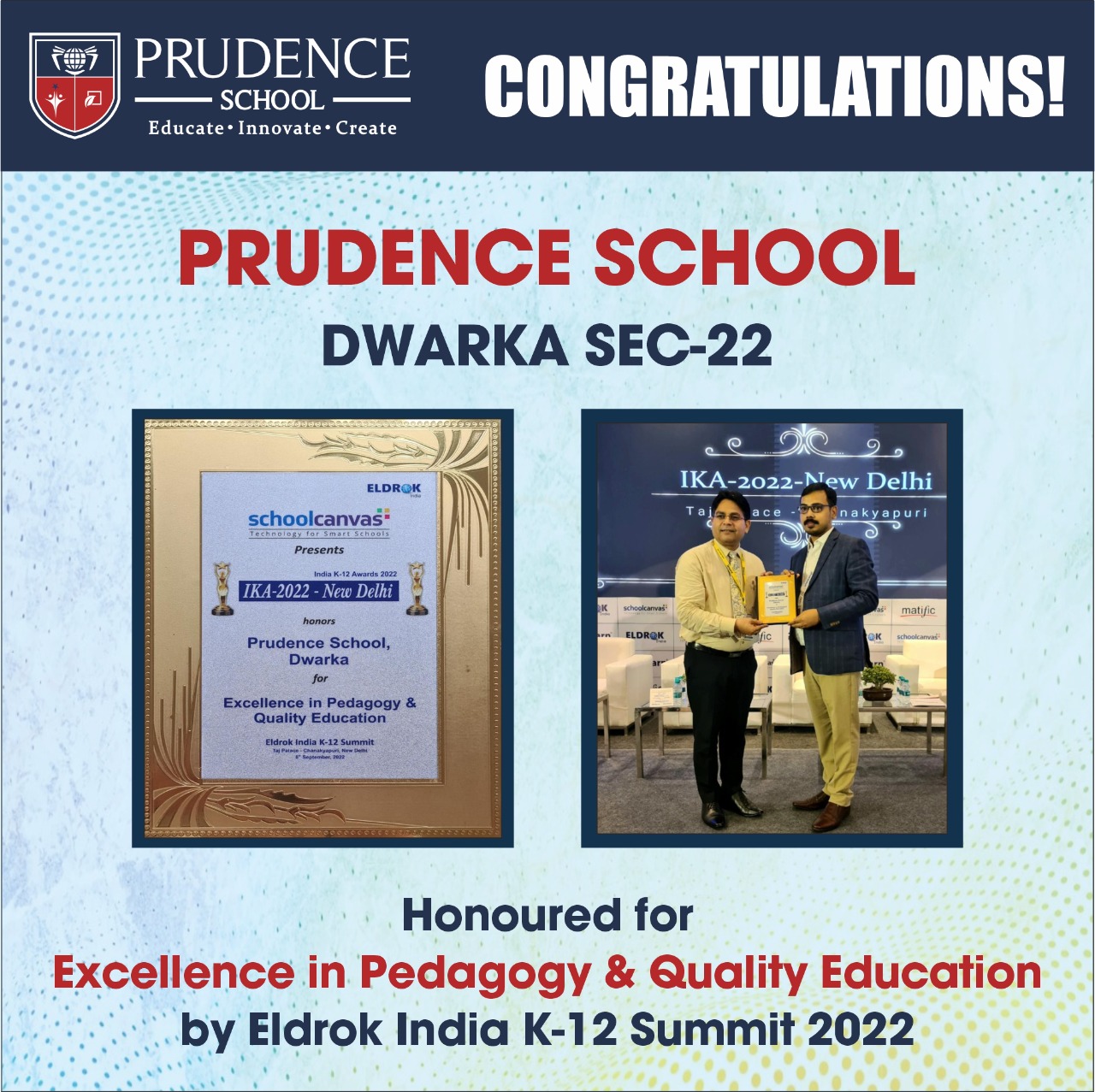 Honoured with an award for Excellence in Pedagogy & Quality Education organised by Eldrok India K-12 Summit, 2022.