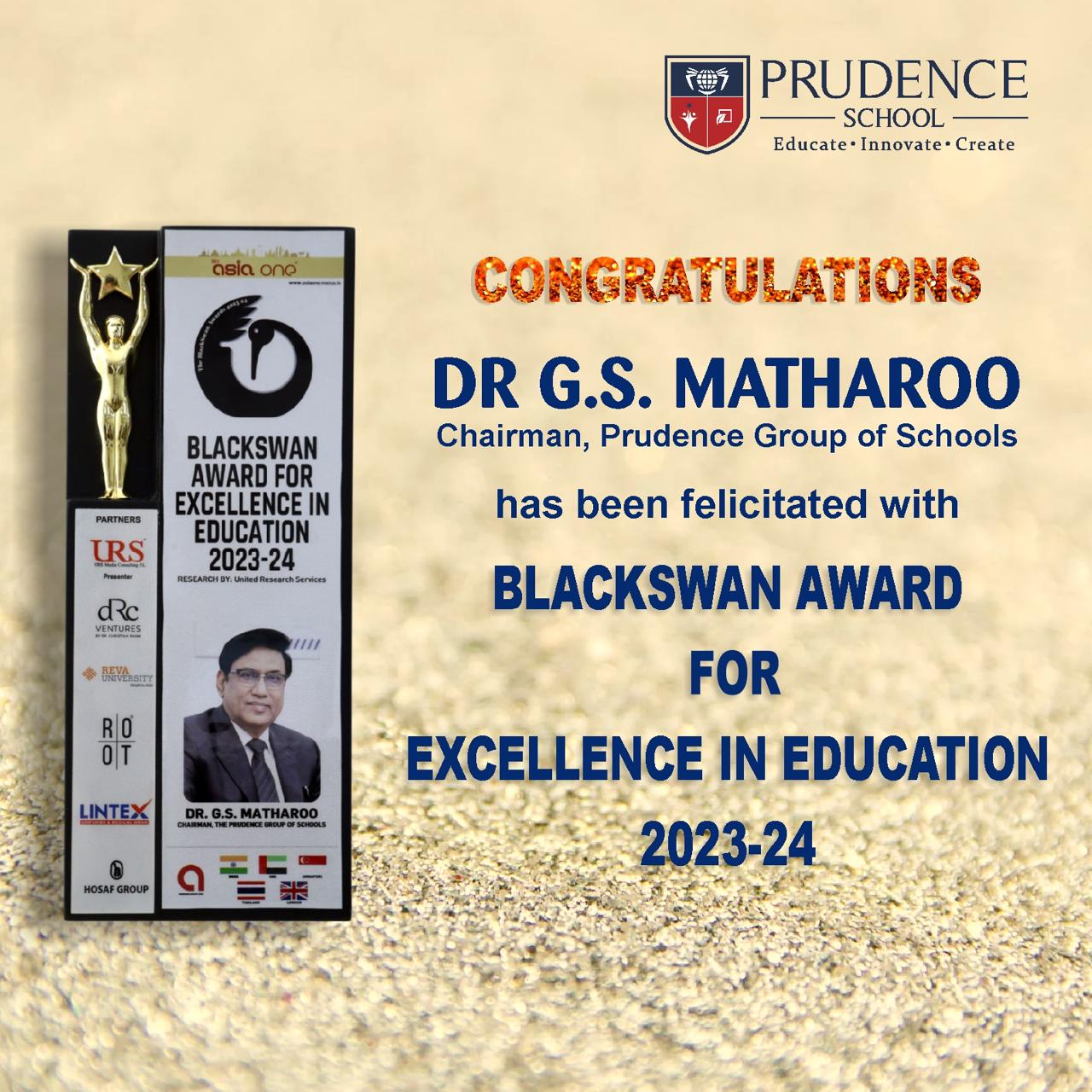 PRUDENCE, Dr. G. S. MATHAROO, for being felicitated with the Blackswan Award for Excellence in Education 2023-24 by AsiaOne.
